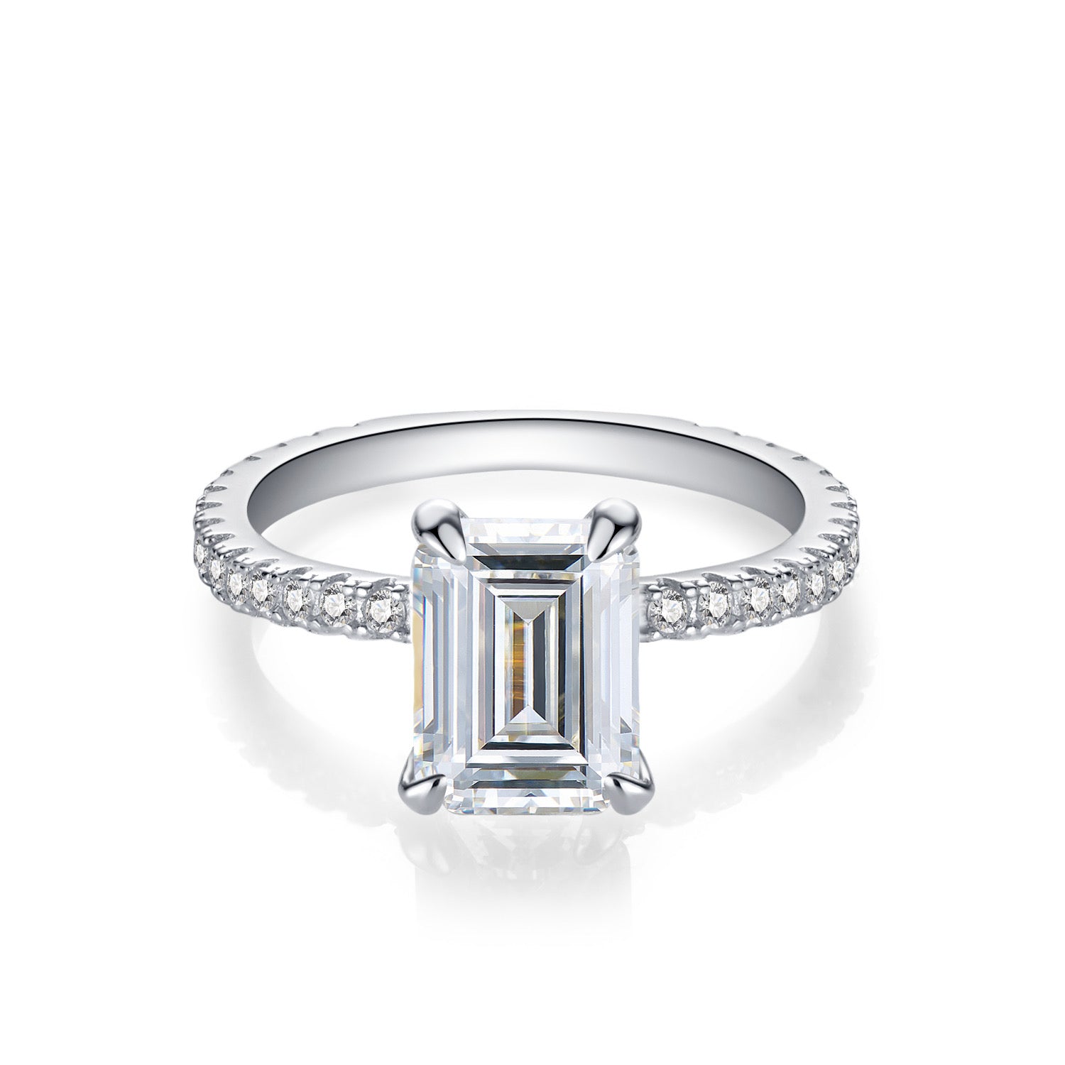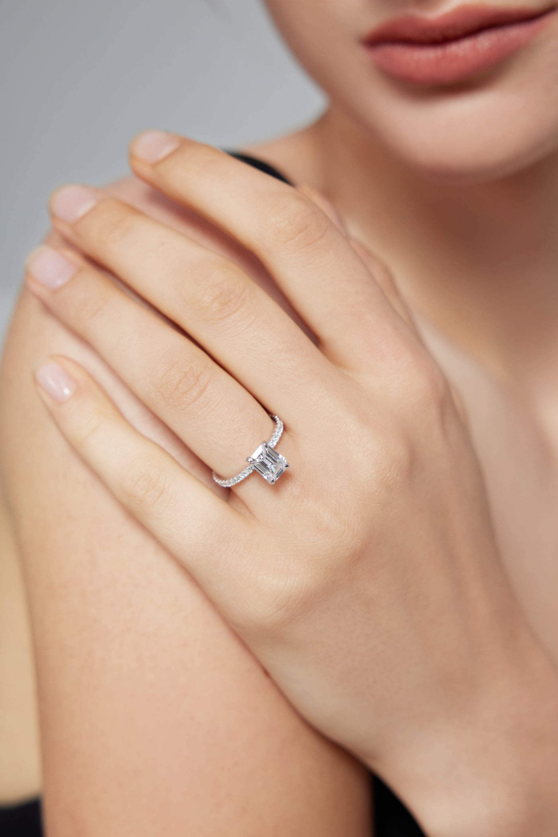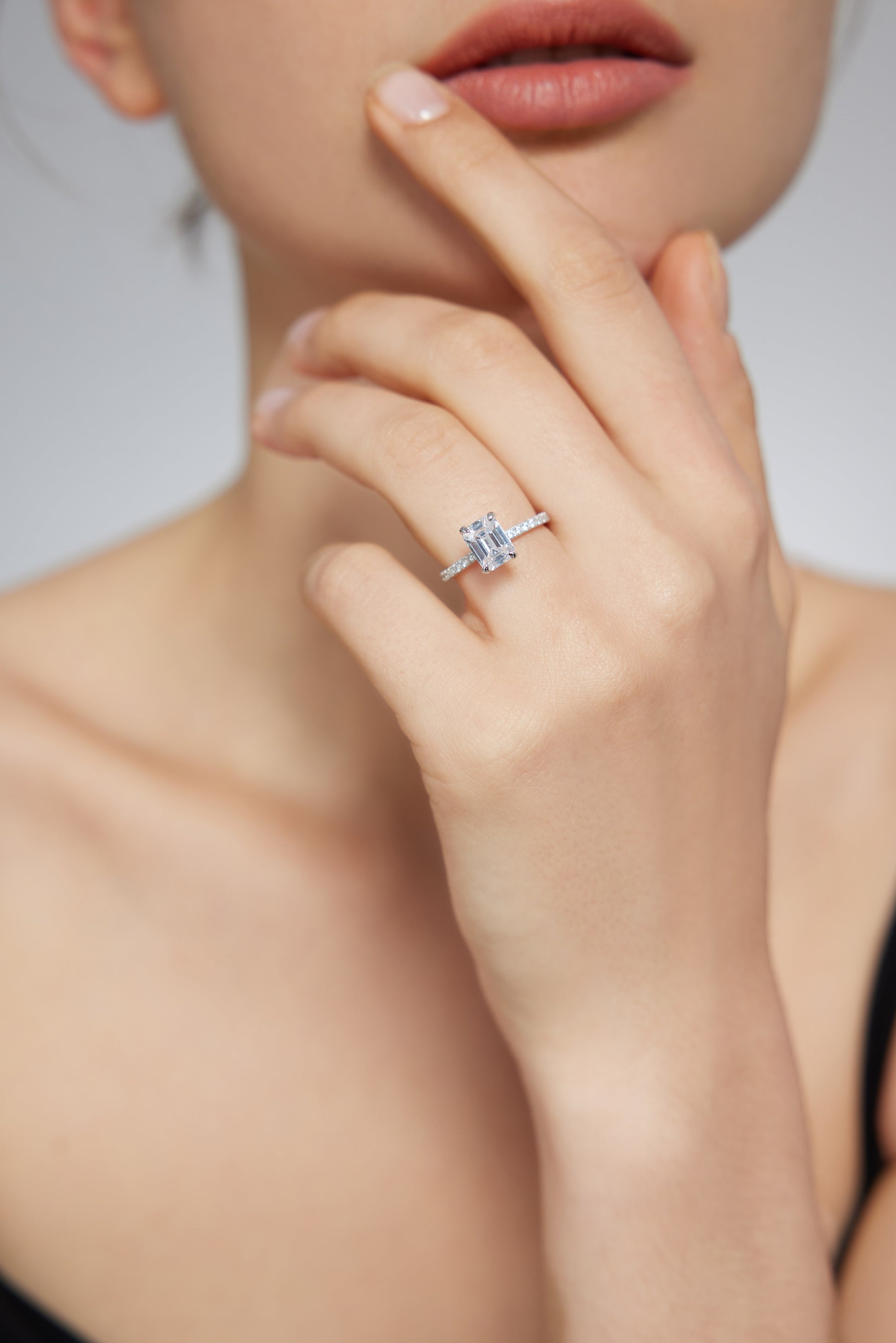 Experience timeless elegance with our 2ct | F Colour | VS2 White Gold Emerald Diamond Ring. The stunning emerald-cut diamond, known for its sophisticated step-cut facets, is set in lustrous white gold, exuding a refined brilliance. Complementing this centerpiece is a pave band adorned with meticulously set diamonds, adding an exquisite sparkle from every angle.