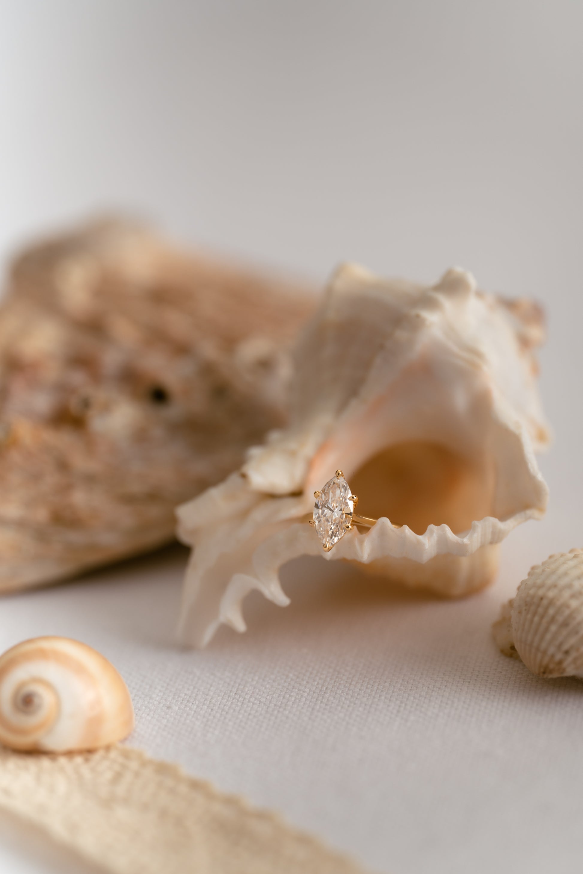 This exquisite piece features a 1.51ct | D Colour | VVS2 marquise diamond, securely held by six delicate claws. The tapered band with a knife-edge design adds a modern touch, making this ring a perfect blend of classic beauty and contemporary style.