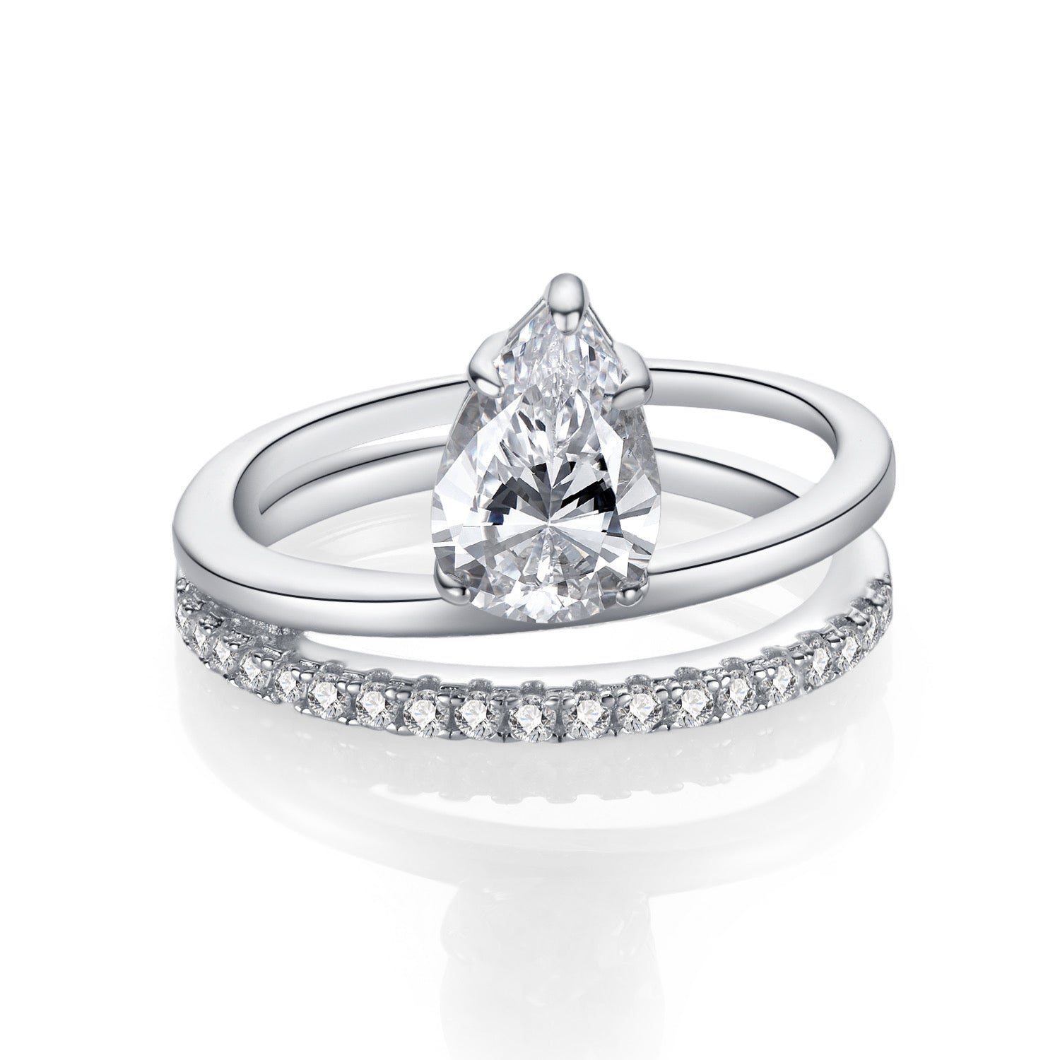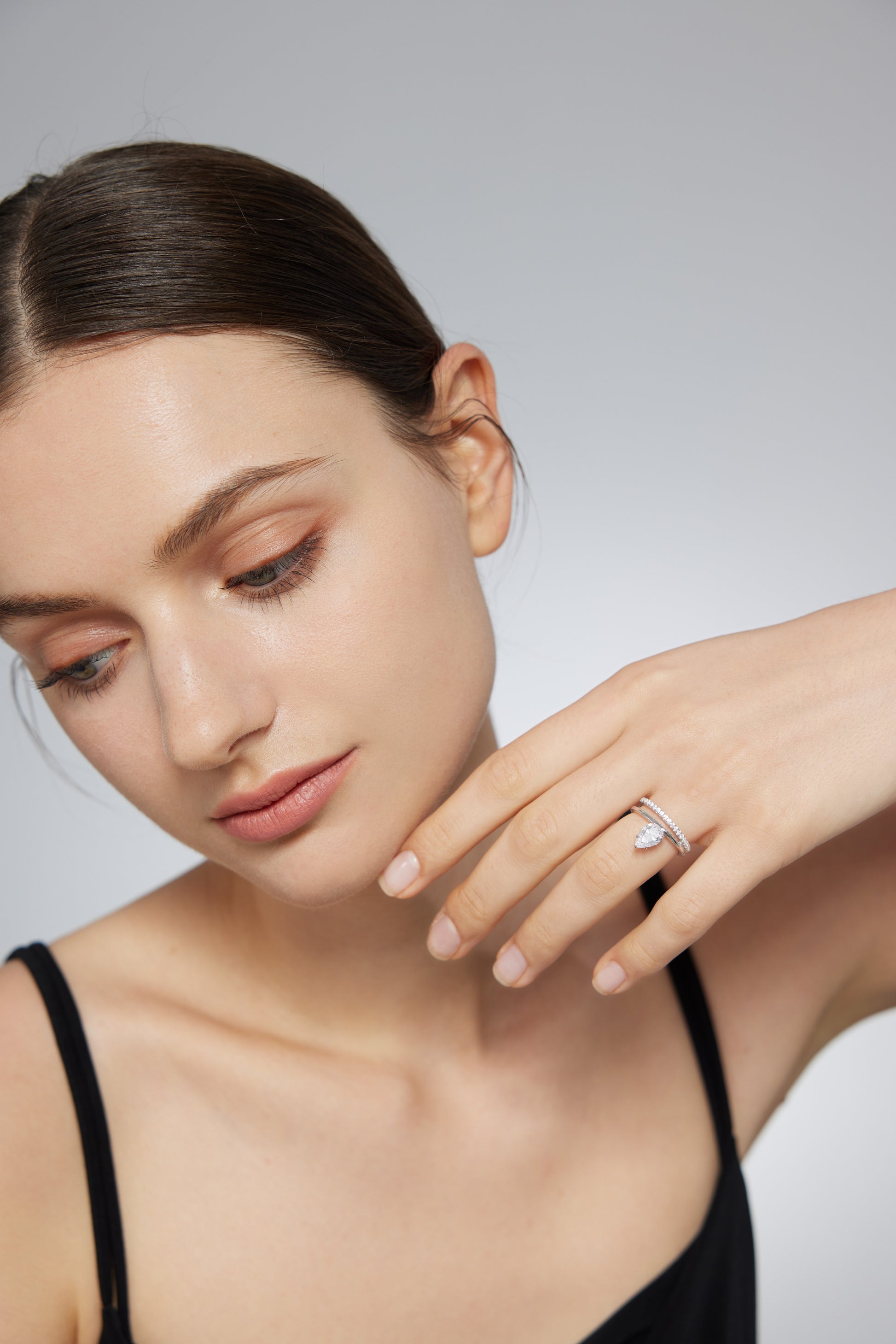 Presenting our 1ct | E Colour | VS2 White Gold Pear Diamond Ring, a true testament to refined elegance. The pear-shaped diamond, set in lustrous white gold, is complemented by a double band adorned with sparkling diamonds. This exquisite piece is designed for those with a discerning taste for sophistication and luxury.